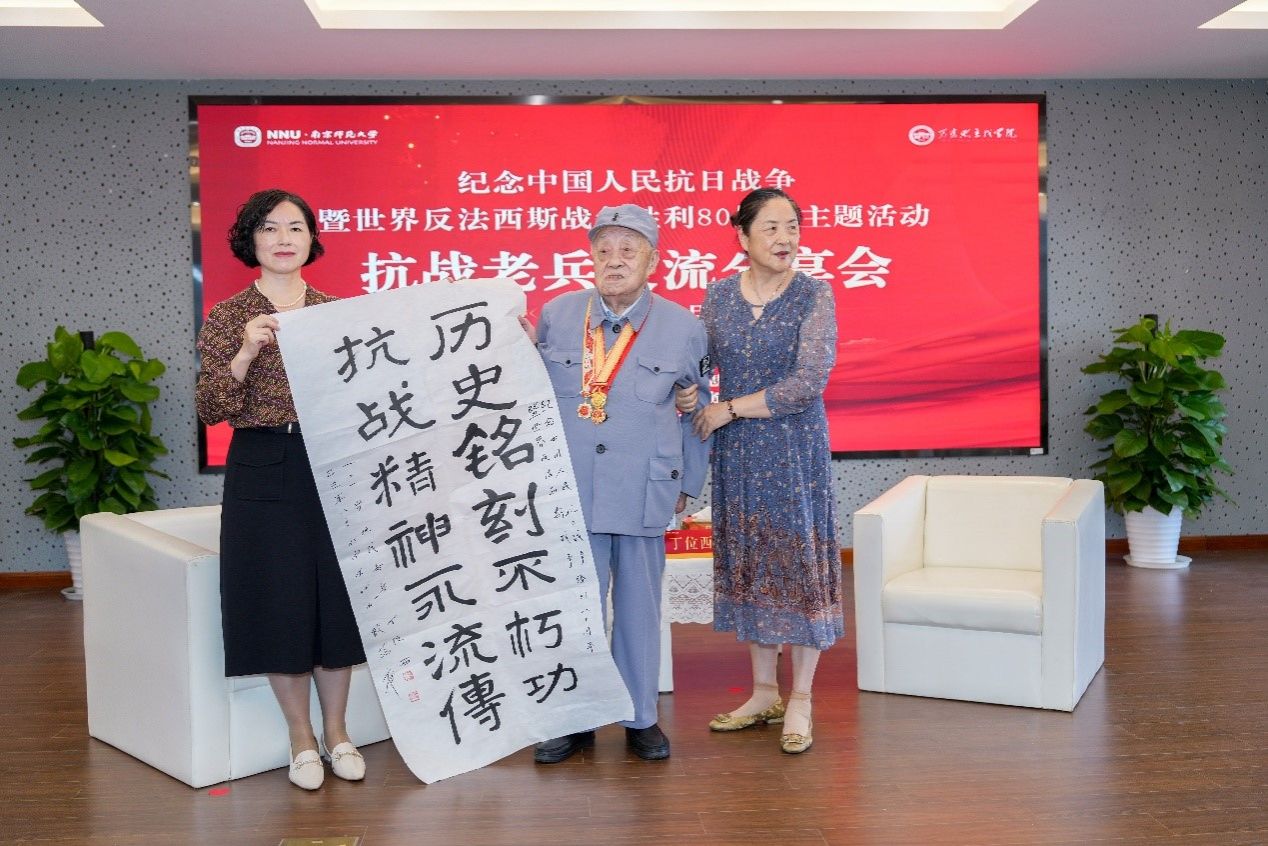 。学院党委书记蒋其琴代表学院接受捐赠,院长洪光东向丁老赠送南师纪念徽章,学生代表郭嘉仪向丁位西老人献花,表达全体师生对其健康长寿的美好祝福。